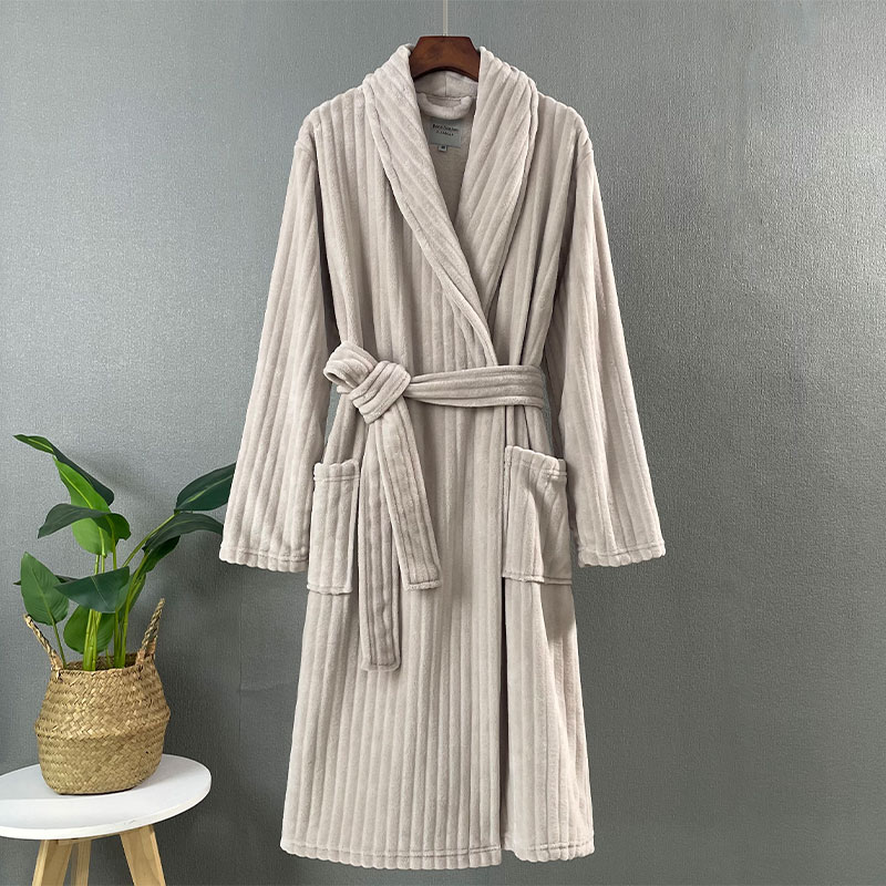Nasz polarowy szlafrok posiada kilka praktycznych detali, które zwiększają jego funkcjonalność. Posiada solidny ściągacz w talii, który pozwala dopasować dopasowanie do własnych preferencji, zapewniając bezpieczne i wygodne zapięcie. Szalowy kołnierz zapewnia dodatkową warstwę ciepła wokół szyi i nadaje szlafrokowi odrobinę elegancji.